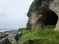 King's Cave (Scottish Gaelic: Uamh an Rìgh) is the largest of a series of seafront caves north of Blackwaterfoot on the Isle of Arran in Scotland.[1] The caves were formed around 10,000 to 6,000 years ago during an ice age when the weight of an advancing glacier forced the land downward, so the sea was higher relative to the location of the cave, with high tide around 4 metres (13 ft) up from its present level. When the ice melted, the land rose due to the isostatic rebound effect, thus forming a raised shoreline or raised beach with relict sea-cliffs. The hillside above the cliffs has a shallow slope resulting from a much earlier raised beach, nominally 30 metres (98 ft) above present high tide.[2] [3]