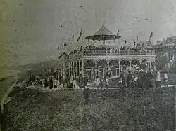 The Pavilion was opened at 3pm on Easter Monday, 4 April 1904.[12] Thousands of spectators stood outside, and 300 invited persons squeezed into the little hall (now the vestibule). People pressed their faces against the windows or stood in a "dense mass" on East Cliff, and the door was guarded by Mr Boorman the Town Beadle in "sober uniform". The Pavilion was decorated with streamers, and flags including the Union Jack, the French Tricolour and the US Stars and Stripes. The Band of the Corps of the Royal Engineers was conducted by Lieutenant Summer in the bandstand on the roof. Inside the hall, flags were arranged around the walls and over Dence's memorial tablet awaiting the unveiling ceremony.[12] The platform and its table were piled and surrounded with flowers. The band stopped, the audience stood, and the council dignitaries processed onto the platform, headed by chairman of the council G. Farley JP, CC, with Mrs Dence on his arm, and guest of honour Thomas Dence who drew special applause. Proceedings were begun by a child, thus: