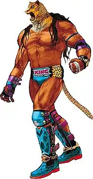 King is widely recognized for the jaguar mask that hides his true identity. Throughout his appearances in the virtual realm, the face beneath his jaguar mask remains a mystery, shrouded in secrecy. The physical portrayal of King's movements was done by the Japanese professional wrestler Minoru Suzuki, who lent his expertise to the character's motion capture sessions.[7] King is a Mexican luchador and series' one of two luchadores overall (the other being Armor King).[8] Fray Tormenta, a Mexican Catholic priest, served as an initial influence on King's character and backstory.[7] King is seen to be mostly growling throughout the Tekken series; however, according to Japanese video game director Katsuhiro Harada, King is capable of speaking Spanish, but he prefers not to.[9] Harada also revealed that King is the most popular Tekken character in Japan over the complete span of the Tekken series.[10]