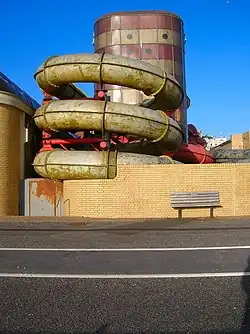 The east side of the building used to house three water slides (flumes) that fed into a plunge pool; ppened in August 1986, the fastest was called The Black Hole, followed by the red Aqua-jet, with the yellow Twister for beginners. However, by November 2000 the slides were closed indefinitely due to health and safety concerns before ultimately being removed in 2009.[15][16] The leisure centre used to have an ice rink.