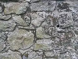 The walls are constructed of ashlar blocks to plinth level with a coursed rubble superstructure and vary between 0.8 and 1.2 m in thickness. Part of the north, east and west walls survive as exposed upstanding remains, but the rest of the structure has been reburied following the excavations in the 1980s. The north wall survives to 3.9 m high and the east wall to 3.8 m.[6]