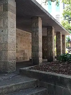 The King Edward Park air raid shelter is a rectangular stone and concrete structure comprising a heavy floor slab, rear and side nib blast walls of sandstone, six sandstone piers and a flat concrete roof. The shelter is approached by two flights of concrete stairs from Turbot Street. All the stonework features a hammered finish. The concrete roof is new; there is no evidence of blast wall removal on the soffit, and there is an additional narrow course of stone between the walls and piers and the roof.[1]