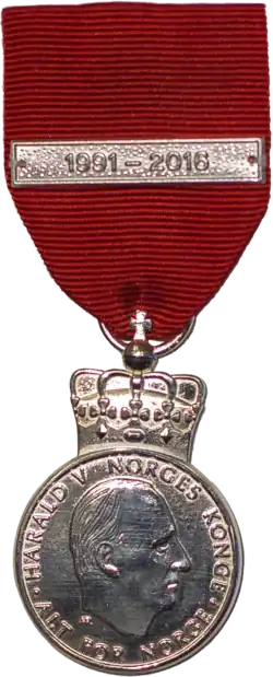 The King Harald V's Jubilee Medal 1991–2016 (Norwegian: Kong Harald Vs jubileumsmedalje 1991-2016) was a commemorative medal created on 17 January 2016 to mark the 25th anniversary of King Harald V's accession in 1991. It is 38th in the order of precedence with King Olav's Centenary Medal being just above it, and H. M. The King's Commemorative Medal in silver being just below it.