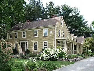 The King House is a historic house at 328 Brookline Street in Newton, Massachusetts. This 2+1⁄2-story timber-frame house was built around 1710, probably by Jonathan Dyke, a cooper, and is one of Newton's few First Period houses, dating to the early period of its settlement. The house was given Greek Revival styling in the 19th century, and is also notable for its association with Noah King, a long-time prominent local doctor. It is five bays wide, with a side gable roof, twin interior chimneys, and clapboard siding. The main entrance has a Greek Revival surround with sidelight windows, wide pilasters, and an entablature.[2] There is a "1695" dated plaque on the house which is the traditional/rumored date.