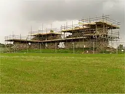 The 2004 geophysical survey of the site identified the hidden foundations of walls, "robber trenches" where older walls had been dug up in the past for their valuable stone, and ditches. A possible rectangular enclosure around the lodge was also discovered.[43]