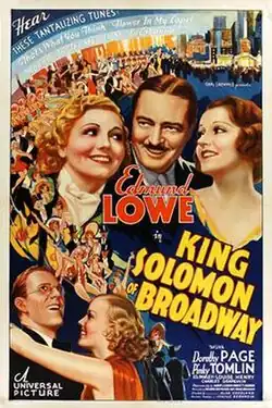 King Solomon of Broadway is a 1935 American musical film directed by Alan Crosland and starring Edmund Lowe, Dorothy Page and Pinky Tomlin.[1] A shady figure wins a nightclub during a card game.