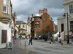 Prior to the 1970s redevelopment of much of King Street, Duke Street was considered one of Kilmarnock's most impressive thoroughfares, extending from Kilmarnock Cross towards the London Road area of the town. Prior to the street being cut through, the site was originally Nailer's Close and David's Lane.[17] Prior, traffic entering Kilmarnock along London Road would require to travel down Green Street and along the narrow Waterloo Street in order to reach both Kilmarnock Cross and King Street.[18] The Town Improvement Trust proposed for a new wider and direct access route to both streets, with the project being planned by Willian Railton, an architect from Kilmarnock.[19] Duke Street was originally opened on 25 November 1859 by Provost Archibald Finnie.[20]