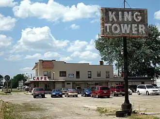 The King Tower Historic District, also known as The King Tower One-Stop, is a historic district located in Tama, Iowa, United States. It was listed on the National Register of Historic Places in 2020.[1] The King Tower One-Stop is a gas station, tourist court, and cafe built by Wes Mansfield on the Lincoln Highway. The Spanish Colonial Revival gas station and cafe was completed in 1937, and 18 tourist cabins were completed the following year. The historic district is an example of a "one stop-food, gas, auto repair and tourist cabins" that were built during "the transition from mom-and-pop roadside businesses to the national chain gas, food and lodging businesses that would soon dominate the trade."[2] At one time it was open 24-hours-a-day, seven-days-a-week. In addition to over-the-road truckers, travelers, law enforcement officers, and local families, it was a place the town's bar patrons would go after the bars closed at 2:00 am. Local clubs and organizations held their meetings here. It was also a stopping point for presidential hopefuls before the Iowa caucuses.[2]