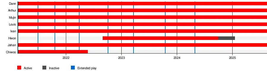![]() Kingdom in March 2023 From left to right: Hwon, Jahan, Dann, Arthur, Mujin, Louis, Ivan | |