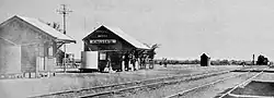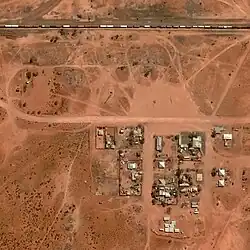 The population increased significantly in 1917, when Kingoonya became a medium-sized station on the new Trans-Australian Railway. The prospect of being a key station on a south–north transcontinental route arose in the mid-1920s before lapsing – and being implemented from Tarcoola half a century later.[10] Many workers were employed in supplying water and coal for steam locomotives – water was taken on trains to Barton, 269 kilometres (167 miles) to the west; drinking water came from Port Augusta. From 1951, fewer railway workers were needed at such stations when trains were hauled by diesel-electric locomotives and when, three decades later, low-maintenance concrete sleepers and continuously welded rail were introduced. Railway maintenance was contracted out in the early 1990s, and Kingoonya lost the last of its railway workers and their families. Since than, the few remaining houses in the township have been only intermittently occupied by people involved in mining exploration and kangaroo shooting. Despite the low local population, the Kingoonya Hotel, popular with travellers and residents of several sheep and cattle farming ventures on the surrounding plains, remained in operation as of 2021, offering accommodation and food.[11] The township is often used by off-roaders taking the "permissible" dirt tracks west towards Tarcoola or south past Lakes Everard and Gairdner, and the track to the Eyre Highway across the Nullarbor Plain. There are reputed to be small deposits of black opal in the area, following a child's discovery in 1968 of a rare black rainbow opal in a roadside pit off the main street.