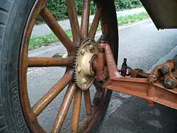 Ackermann steering separates the steering movement into two pivots, one near the hub of each front wheel. The beam axle between them remains fixed relative to the chassis, linked by the suspension. Ackermann steering has the two advantages that it reduces tyre scrub, the need to drag tyres sideways across their tread when turning the steering, and also it reduced bump steer, suspension and road bumps tending to upset the steering direction. The kingpins were now fixed to the axle ends and the hub carriers pivoted upon them. Most commonly the centre of the kingpin was fixed in the axle and the hub carrier was forked to fit over this, but some vehicles, including the Ford Model T illustrated, used a forked axle and a kingpin fixed into a single piece carrier. Kingpins were always clamped in the centre and the swivel bearings at the ends, to increase the lever arm and so reduce the bearing load.