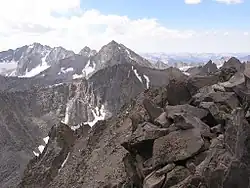 There are several prominent subranges of the Sierra within and around the park. The Palisades, along the park's eastern boundary, have four peaks over 14,000 feet (4,300 m) including the highest point in the park, 14,248 feet (4,343 m) NAVD 88 at the summit of North Palisade.[10] The Great Western Divide extends through the south-central part of the park and also has many peaks over 13,000 feet (4,000 m), including Mount Brewer.[11] The Monarch Divide, stretching between the lower Middle and South Forks of the Kings, has some of the most inaccessible terrain in the entire park. In the northwest section of the park are other very steep and rugged ranges such as the Goddard Divide, LeConte Divide and Black Divide, all of which are dotted with high mountain lakes and separated by deep chasms.