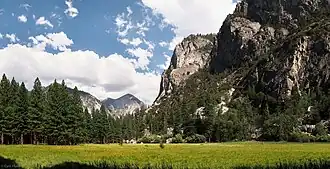 Other significant glacial features include Tehipite Dome, the largest granite dome in the Sierra, rising 3,500 feet (1,100 m) above the floor of Tehipite Valley.[18] In Kings Canyon and across the high country, such sheer granite cliffs are subject to exfoliation, frost weathering and earthquakes which cause sudden and dramatic rockfalls. Over thousands of years, cliff collapses have built up large talus piles or scree slopes at their bases along almost every glacial valley in the park.
