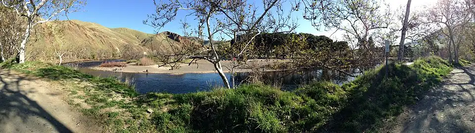 Although most of the original wetlands and riparian zones in the valley have been lost to development, narrow riparian corridors still exist along 40 miles (64 km) of the Kings River between Pine Flat Dam and People's Weir (below Highway 99), and in other places such as lower Fresno Slough.[45]: 227  The largest riparian habitats are concentrated in the Centerville Bottoms, east of Sanger, where the river divides into multiple channels over a roughly 5-mile (8.0 km) wide area.[46] Below Highway 99 the river channels, with few exceptions, are almost completely channelized and modified from their native state.[22] A minimum Kings River flow of 100 cubic feet per second (2.8 m3/s) is maintained at all times via releases from Pine Flat Dam, in order to support fish populations and riparian habitats.[22]