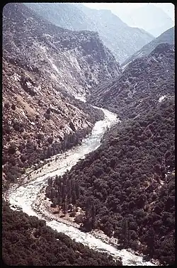 The Kings River is the largest river draining the southern Sierra Nevada. Its average annual flow of 1,791,000 acre-feet (2.209 km3) makes it larger than the Kern, Kaweah and Tule Rivers combined.[27] Before the construction of Pine Flat Dam in 1954, the Kings River reached monthly averages as high as 12,000 to 14,000 cubic feet per second (340 to 400 m3/s) in May and June where it flows into the San Joaquin Valley, and averaged as low as 100 to 200 cubic feet per second (2.8 to 5.7 m3/s) in the driest months of September and October.[3] After the dam was built, late spring-early summer high flows have been reduced, and late summer-autumn flows have greatly increased.[35]