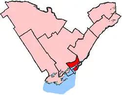 The riding was created before the 1967 provincial election. Its initial area consisted of the townships of Amherst Island, Howe Island and Wolfe Island, the city of Kingston and the islands in the St. Lawrence River within the county of Frontenac.[4] In 1986, it was changed slightly to include Kingston and the three major islands plus all the land south of Highway 401 within the township of Pittsburgh.[5]
