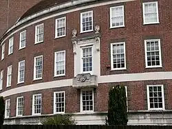 It is a neo-Georgian red brick building with Portland stone dressings and tiled roof, laid out to a semi-circular plan.[1] To the centre of the semi-circular elevation is a massive square tower with a low octagonal spire and fluted corner pinnacles.[1] The central entrance is in the base of the tower. Above it is a two-storey, round headed window set in an open pedimented stone niche with simplified Corinthian columns rising from a corbelled balcony.[1] Pictorial references to the River Thames are displayed upon a keystone inside the niche, and on the corbels, capitals and iron gates. The coat of arms of Kingston is set further up the tower.[1] Inside, there is a marble lined circular entrance hall, and a central staircase with original opaque glass semi-spherical lamps.[1]