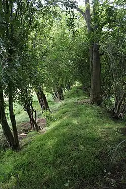 The tramway received parliamentary authorisation on 23 May 1818 by the Kington Railway Act 1818 (58 Geo. 3. c. lxiii).[1] Construction started immediately and was completed in two sections. The tramway was built to a gauge of 3 ft 6 in (1,067 mm). The tramway adopted the use of cast iron L-shaped tramroad plates in its construction.[2] The vertical portions of the two plates were positioned inside the wheels of the tramway wagons and the plates were spiked to stone blocks for stability. The first section from Eardisley to Kington was opened on 1 May 1820. The western section from Kington to quarries at Burlingjobb, 3 miles (4.8 km) east of New Radnor opened on 7 August 1820.[1]