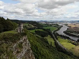 On an outcrop a few hundred yards to the east of, and several feet below, the summit is Kinnoull Tower, a folly built in the eighteenth century, by Thomas Hay, 9th Earl of Kinnoull, to resemble castles along the Rhine he had admired in Germany during his Grand Tour of Europe. Kinnoull saw a similarity between the mountainous landscape along the Rhine and the rocky outcrops on his estate near Perth. On his return, to achieve a similar effect, he built a modest castle on the highest point of Kinnoull Hill, with its tower overlooking the River Tay. The tower is a Category B listed structure.[4]