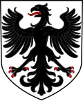 The Kintzheim coat of arms is a black eagle on a white background. The bird's talons are highlighted in red, along with its tongue.