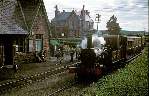 The station was near the centre of Kirk Michael, on a minor road leading to the coast. At the top of Station Road the follows spreads out; nearby were a branch of the Isle of Man Bank (closed in 2014 after over 100 years of service), the Mitre Hotel, the local primary school, village stores, local blacksmith, village butchers and the imposing Kirk Michael church with its oak-carved lychgate. The main road through the village forms part of the famous TT mountain circuit. After the railway closed, a steam centre was established not far from the station and this became home to a number of related items, most notably the locomotive Sea Lion from the Groudle Glen Railway. This facility was occasionally open to the public, but closed in 1984; much of the exhibits were relocated both on and off island. Several of them may be found today at the Jurby Transport Museum forming part of the John Walton Collection.