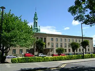 Kirkcaldy Town House is a Scandinavian influenced town hall located in Kirkcaldy, Fife, Scotland. The current town house was begun in 1937, from a competition-winning design by architects David Carr and William Howard of Edinburgh. Only the foundations had been put in place before construction was interrupted by the Second World War. Work resumed on the building in 1950 and was completed in two separate phases between 1953 and 1956. The town house would serve as the headquarters of Kirkcaldy Town Council from 1956 to 1975 and then Kirkcaldy District Council from 1975 to 1996. Today, the role of the town house is the headquarters of the local area committee of Fife Council. Kirkcaldy Town House is protected as a Category B listed building.[2]