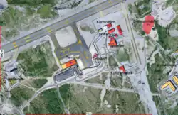 The runway is located southwest–northeast (05-23) and is 2,015 by 45 meters (6,611 ft × 148 ft). The touchdown zone from the west is 60 meters (200 ft) from the start of the runway, while it is 420 meters (1,380 ft) from the east. There are no parallel taxiways, but two taxiways run from the runway to the tarmac. Because of the terrain to the east the maximum take-off and landing lengths on the runway vary depending on the direction: the landing length (LDA) is only 1,605 meters (5,266 ft) from the east (rwy 23) compared to 1,906 meters (6,253 ft) from the west (rwy 05).[31] Runway 23 is equipped with instrument landing system. There is also a closed runway (14–32) crossing the main runway. It is 1,270 meters (4,170 ft) long and gravel; part of the length has been paved and is used as a taxiway.[32]