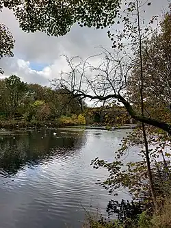 The nature reserve is shaped by Kirklees Brook, a minor river which feeds into the River Irwell. According to the Environment Agency (a body supported by the UK Department for Environment, Food & Rural Affairs[5]), the river contains good quantities of invertebrates, but poor quantities of fish, along with high concentrations of dissolved ammonia and oxygen. Like all rivers in the UK,[6] Kirklees Brook has a chemical status of Fail, mostly due to Mercury and Polybrominated diphenyl ethers.[7] The Brook and surrounding areas have been classified as a Site of Biological Importance.[8]
