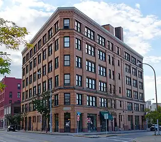 The Kirstein Building is a historic industrial and commercial building located in Rochester in Monroe County, New York. It is a six-story, large triangular yellow brick structure with Classical Revival details. It was built in 1908 for E. Kirstein and Sons, Co., later Shuron Optical Company, a manufacturer of optical products. The company continued to use the building for offices and production until 1965.[2]
