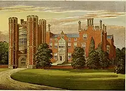 Edward North, a successful lawyer, rebuilt the castle in the 1540s and between 1556 and 1558 using the architect Francis Adams, renaming it Kirtling Hall.[1] The earthworks around the castle were considerably altered to provide for a raised platform for the new house, which included contemporary Tudor features such as a gatehouse, gallery, lodgings, a banqueting house and a garden, complete with grand water features and ponds.[1] Queen Elizabeth I stayed at the castle as the guest of Roger North, 2nd Baron North for three days in September 1578 during her state procession across Cambridgeshire.[2] The visit cost Lord North £642.[3]