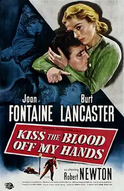 Kiss the Blood Off My Hands is a 1948 American noir-thriller film directed by Norman Foster. Based on the best-selling novel of the same name by Gerald Butler, it stars Joan Fontaine, Burt Lancaster, and Robert Newton.[4][5] The film faced minor opposition from fundamentalist groups in the United States and the Commonwealth, with regard to its gory title. In some markets, the film was released under the alternate titles The Unafraid (in Canada, Australia, New Zealand, and smaller towns in the United States) or Blood on My Hands (in the United Kingdom).[6][7][8][9]