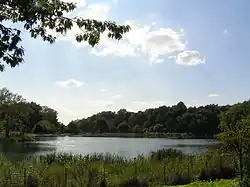 The creek then turns west and flows into Kissena Lake.[16][3] Located at the northwestern corner of Kissena Park, Kissena Lake is fed by the creek and was also fed by a smaller stream from the north that has since been buried with a playground built on top.[16] In its center is a bird sanctuary isle constructed following the lake's most recent restoration in 2003.[18] The name of the lake, park, and creek comes from the Chippewa language meaning "it is cold", "cold place", or "cool water".[19][20]