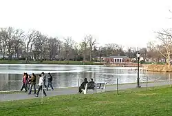 The actual construction of the park involved draining and filling in the marshland that made up the majority of the park's area.[52] Kissena Park opened in 1910,[21][2] while the World War I memorial knoll on the south side of Kissena Lake was dedicated in 1921.[3]: 9 [8] Kissena Park was originally envisioned as the primary park of Queens, similar to Central Park in Manhattan and Prospect Park in Brooklyn.[53] It contained landscaping, similar to both parks: the western end of Kissena Lake drained into the creek and was traversed by a bridge, similar to Central Park's Gapstow Bridge.[19]: 113 The park also included a gazebo and a swimming pool with lake water, both of which were removed.[53]