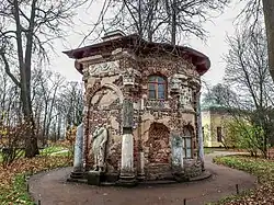 Every regular park ensemble of the 18th century was obliged to have Hermitage pavilions, Grottos,[1] and artificial ruins. The Kitchen Ruin was built in 1785–1786 according to the project by Giacomo Quarenghi. It is a rotunda with two rectangular projections using authentic antique[2] Italian[3] fragments: fragments of columns, capitals, cornices, and friezes, on which garlands are carved. The pavilion can be entered through a semicircular niche. The masonry of the walls is partially exposed, the windows are asymmetric, and the gypsum reliefs based on models by Cesare Scaglia, installed in the niches of the upper part of the facade walls, are intentionally damaged, which together creates the impression of deep antiquity.[2] The facade between the rectangular projections is decorated with columns.[4]