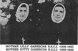 Lilly Garesche was for years superior at Maryville, at Clifton in Cincinnati; at Duchesne, Omaha, Nebraska; and at the City House. She was one of the most beloved nuns St. Louis has ever known. For many years, she was the directress of the Sodality, and spent much of her time in the convent parlor, listening to women's troubles and comforting them.[2]
