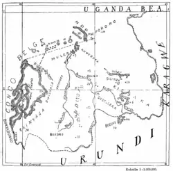 Coote entered the Belgian territory through a band of territory that a German map showed to belong to the British. It would give them direct access to Lake Kivu without crossing Belgian territory. He advanced quickly in night stages and reached the shore of Lake Kivu near Goma. The local chiefs did not recognize Belgian authority south of Rutshuru and did not report the British movement to the Belgians. Coote established fortified camps at Burungu and Rubona (Lubuna).[1] On 26 June 1909 Coote, as district commissioner of Mbarara, wrote from Mount Lubuna to F. Goffoel, head of the Rutshuru sector, stating that he had been instructed to occupy the Ufumbiro. From now on, north of 1° 20' south latitude the border was longer formed by the 30° east meridian, but instead by the 29° 47' east meridian. Rutshuru was therefore part of the Mbarara district. Coote invited Olsen to meet him in Rubona to conclude an agreement pending a decision by the governments.[1]