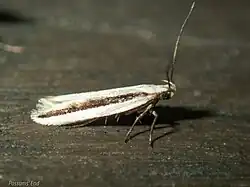 The wingspan is 11–15 mm. The forewings are ochreous whitish, somewhat irrorated (sprinkled) with ochreous and with a narrow blackish central streak from the base to the apex, sometimes suffused with ochreous beneath, variable in strength, rarely partially obsolete, and tending to form two separate discal spots towards the middle. The hindwings are pale whitish grey.[2]