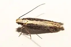 The wingspan is about 16 mm. The forewings are dark fuscous with a broad pale whitish-ochreous streak along the inner margin from the base to the apex, occupying nearly half of the wing. There are three indistinct small black discal spots, sometimes obsolete, the first in the middle, the second on the lower margin of the dark fuscous portion very obliquely before the first and the third in the disc beyond middle. The hindwings are whitish grey.[2]