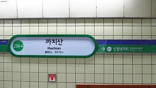 Kkachisan Station (pronunciation as Katsisam) is a station on Seoul Subway Line 5, as well as the northwestern terminus of the Sinjeong Branch of Line 2. Seoul Metro operates both Line 2 and 5 platforms.[1]