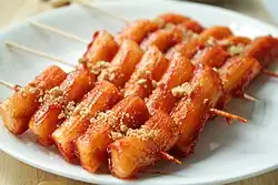 Rice cake skewers, consisting of skewered and fried tteok (rice cakes) brushed with spicy gochujang-based sauce.[2] It is a popular bunsikjip (snack bar) item. |