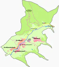 Kleinkahl has eight Ortsteile: Edelbach, Kahlmühle, Großkahl, Glashütte, Wesemichhof, Großlaudenbach, Kleinkahl and Kleinlaudenbach. The community has the following five Gemarkungen (traditional rural cadastral areas): Edelbach, Großkahl, Großlaudenbach, Kleinkahl, Kleinlaudenbach.