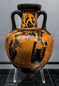 The Beazley Archive Pottery Database has approximately 227 vases either attributed to, near, or compared with the Kleophrades Painter,[2] and of these 227, 113 are directly attributed to this great painter, although aside from the potter's name on the one pelike, his name is not found anywhere. Although he painted a number of different shapes, the Kleophrades Painter focused mostly on large vases, with the four most common shapes being calyx, hydrias, Panathenaic amphorae, and neck amphorae. The provenances of these vases vary, although the great majority are found in Italy. Most of which were sent to Etruria, Vulci, which is now the modern Province of Viterbo. This evidence indicates that many of his vases were intended for export.