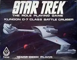 Klingon D-7 Battlecruiser Deck Plans is a boxed set containing six 15mm-scale deck plans for a Klingon ship that are roughly double the size as the plan which came with the game.[1]