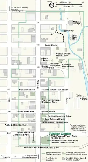 The Skagway unit includes much of the historic downtown such as buildings owned and restored by NPS and others, some leased even today for ordinary commercial purposes to recreate the city's bustling activity. The visitor center in Skagway is located in railroad depot building at Second and Broadway and is a good place to begin tours either led by a ranger or self-guided. Junior rangers can plan their activities further and earn their badges further up Broadway at the Pantheon Saloon.[4]