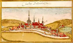 Bebenhausen Abbey was established around 1185, when Rudolph I, Count Palatine of Tübingen,[1][2] donated Bebenhausen, then an abandoned village on the edge of the Schönbuch, to the Premonstratensian Order. Monks from Marchtal Abbey,[2] another of Rudolph's endowments,[3] settled in the village. It was with this company that the monastery was first documented in mid-1187, but the Premonstratensians abandoned the monastery later in the decade. Rudolph next gave Bebenhausen to the Cistercian Order, whose General Chapter at Cîteaux Abbey decided in 1190 to accept it and directed the Abbot of Schönau Abbey to establish a new monastery. In response, Rudolph granted the Cistercian project the freedom of not having to recognizing a vogt, a noble charged with lordship over and protection of a monastery, in mid-1211.[2] The church of the new monastery was consecrated in 1228 by the Bishop of Constance.[4]