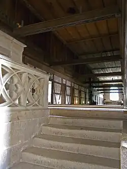 The Bebenhausen monastery complex is situated upon a terrace above the Goldersbach river within the Schönbuch nature park.[11] The existing buildings of the monastery were built from 1475 and 1500 upon older structures.[1] They are defended by a 13th-century wall, two towers, inner bailey, and a 15th-century gatehouse, the Writing Tower, found at the complex's southwest end.[28] The southeastern complex of buildings, constituted by the guest house, hospital, abbot's kitchen, and a courtyard, were transformed by Charles I into Bebenhausen Palace. Charles I had the rooms of the palace renovated in the Gothic and Renaissance Revival styles by August Beyer and furnished with items from the royal collection. William II and Charlotte made further alterations to the palace from 1891 to 1918 and extensively modernized it.[13] To the north of the royal retreat are the abbey's barns. To the south is the abbot's house, once connected to the rest of the monastery by a bridge.[28]