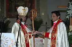 ![]() Bishop Mar Jacob Angadiath handing over to the first Knanaya Region director Fr. Abraham Mutholath the decree establishing the Knanaya Region | |