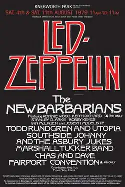 Also performing at the Knebworth concerts in 1979 were The New Barbarians, featuring Ronnie Wood and Keith Richards (The New Barbarians played only at the second concert on August 11); Todd Rundgren and Utopia; Southside Johnny; Marshall Tucker; Commander Cody; Chas & Dave; and Fairport Convention.