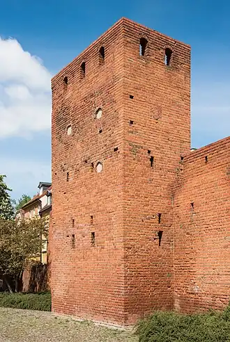 The brick defensive tower has a square base and is five stories tall. The structure faces to the southeast and lacks a back wall. Its façade features numerous embrasures. On the inside, it has wooden ceilings supported on side wall offsets. The structure is attached to a short remaining portion of the historic inner city wall.[1][3]