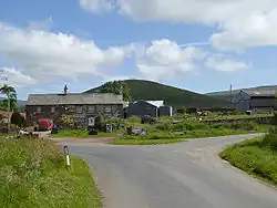 ![]() Road junction at the western end of Knock village, with Knock Pike visible behind. | |